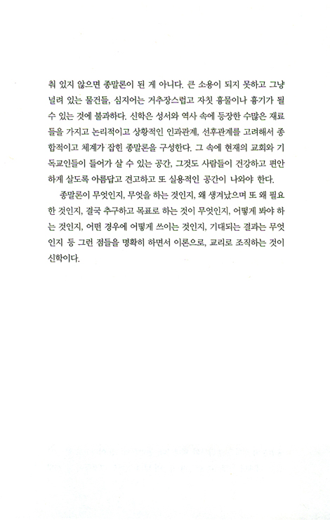이 책은 종말론이 무엇이며, 그 진정한 의미는 무엇인지, 그것을 어떻게 해석해야 하는지를 보여준다. 동시에 종말론을 한국교회와 기독교인들의 구체적인 상황에 어떻게 적용해야 하는지, 그럼으로써 교회와 신자들과 더 나가서 사회의 문제들까지도 극복하게 하며, 사람들이 올바른 신앙과 영성, 생명으로 거듭나도록 돕는다. 또한 이 책은 신학뿐만 아니라 성경을 구체적으로 보면서 종말론을 하나하나 해석하고 설명해준다. 사실 종말론은 성경 구약에서부터 신약까지 오랜 역사적 변천을 겪으면서 발전해온 것이다. 그래서 성경을 보면 종말론의 다양한 종류와 형태들, 성격들, 특징들, 의미들을 이해할 수 있다. 이 책은 그런 성경의 종말론을 직접 살펴봄으로써 그것이 어떤 상황에서, 어떤 발전 과정을 거쳐서, 어떤 식으로 완성되었는지를 파악하게 하며, 그 속에 계시된 교회와 인류를 향한 하나님의 뜻이 무엇인지를 깨닫게 한다.