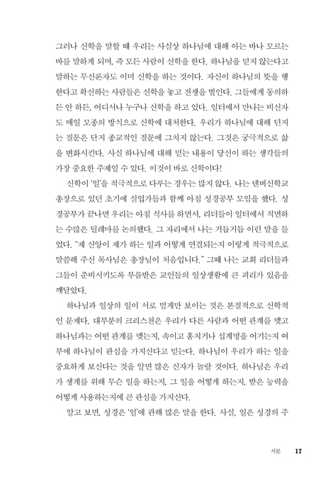 사람들은 깨어 있는 시간의 대부분을 일하고 경력을 쌓는 데 보내건만, 정작 교회는 그 문제를 다루는 데 거의 시간을 쓰지 않는다. 그 결과, 사람들은 성경이 자신의 실제 경험을 다루지 않는다고 무의식적으로 생각하게 된다. 그러나 그 생각은 틀렸다.