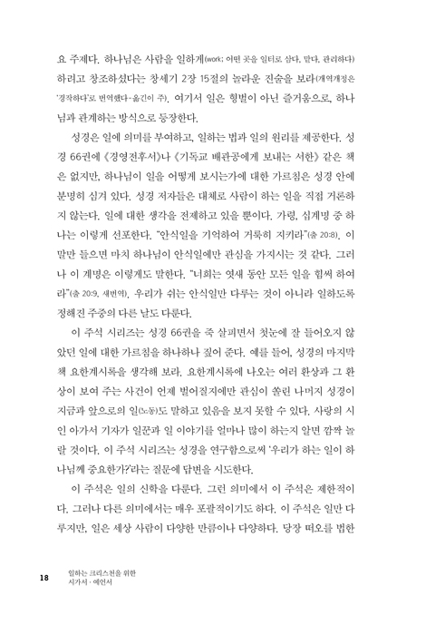 맨 처음부터 하나님은 우리를 일하는 존재로 지으셨다. 우리 각자에게 있는 은사와 부르심은 다른 사람을 섬기는 가운데 하나님의 영광을 되비추고 성취감을 얻게 하고자 주신 것이다. 이 특별한 주석은 ‘일’이라는 중요한 성경 주제에 대한 포괄적인 전망을 제시한다.