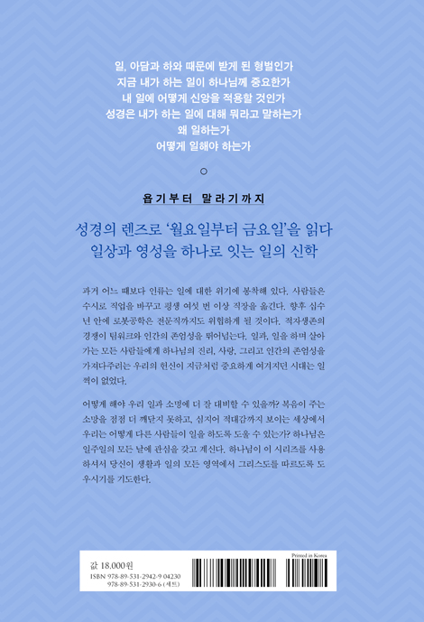 노동이라는 주제가 성경 전체에 스며 있다. 노동의 교리를 다룬 대중서적은 많지만 일의 신학을 다룬 책은 별로 없다. 이 시리즈는 하나님 관점에서 일에 대한 통찰력을 얻기 위해 성경 본문을 책별로 하나하나 연구한 첫 번째 책이다.