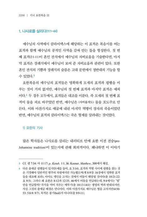 본서는 요한복음의 유대주의적, 그리스-로마적 배경을 심도 있게 탐구한 탁월한 주석서로, 저자인 크레이그 S. 키너 박사는 요한복음과 관련된 학자들의 모든 제안을 총망라하는 동시에 그것의 장점과 단점을 잘 제시하고 있다. 일례로 본서의 참고문헌의 양은 160페이지에 이른다.