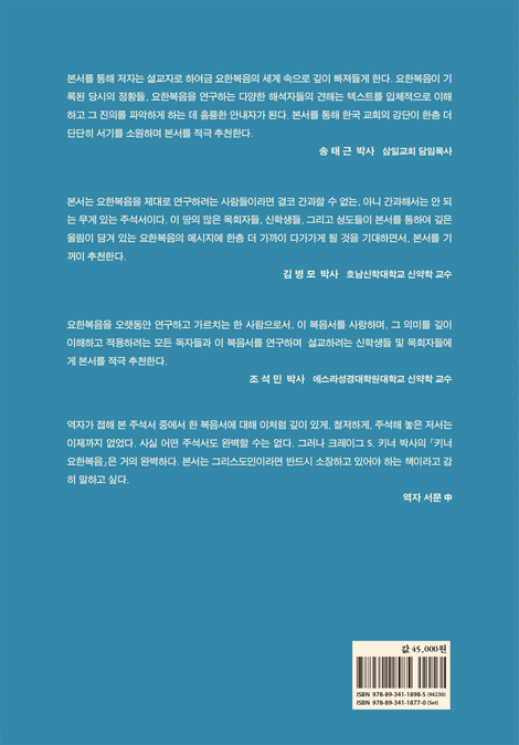 본서는 요한복음을 제대로 연구하려는 사람들이라면 결코 간과할 수 없는, 아니 간과해서는 안 되는 무게 있는 주석서이다. 이 땅의 많은 목회자들, 신학생들, 그리고 성도들이 본서를 통하여 깊은 울림이 담겨 있는 요한복음의 메시지에 한층 더 가까이 다가가게 될 것을 기대하면서, 본서를 기꺼이 추천한다.