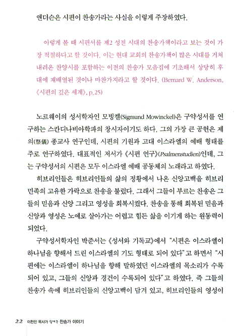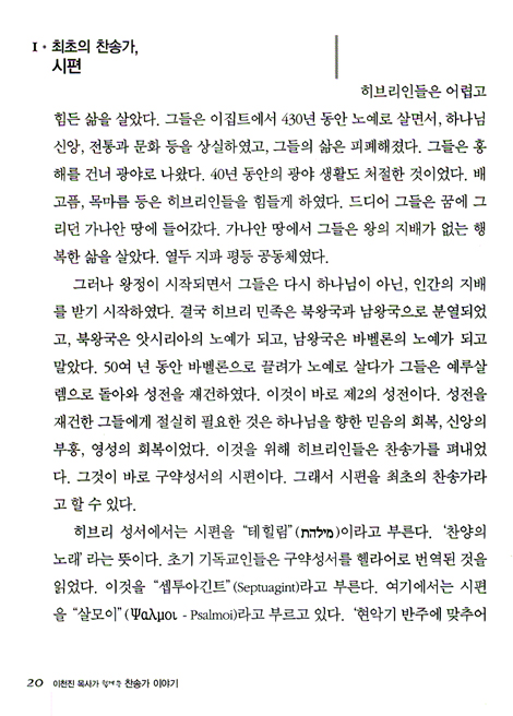 성서와 세계 교회사를 통해 흐르는 찬송가의 역동적인 흐름과 전승과정을 알기 쉽게 소개하면서 한국인의 영성이 담긴 새로운 찬송가를 열망하게 한다.