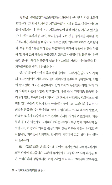 “오랫동안 기독교학교 설립을 꿈꾸는 이들이 이미 만들어진 학교들을 탐방하고, 그 깨달은 바에 따라 시행착오를 겪으면서 또 다른 기독교학교들을 세워 나갔다. 우리도 마찬가지였다. 이 책이 좀 더 빨리 나왔었더라면, 너무 좋앗을 것 같다. 그랬다면 하지 않아도 될 실수를 훨씬 줄일 수 있었을 것이다.”