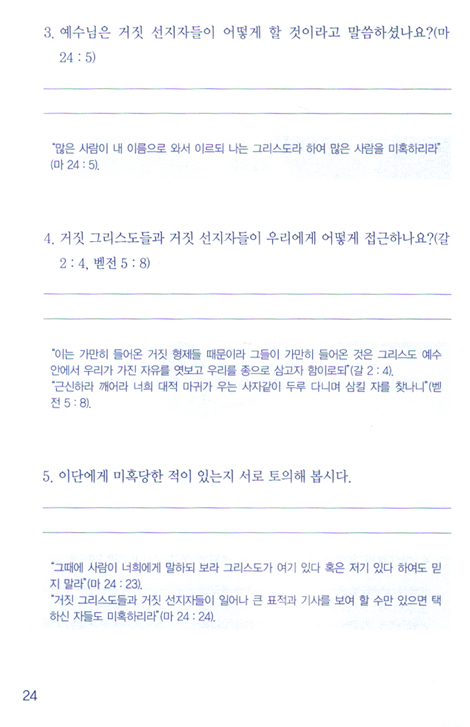 본서는 평신도를 대상으로 진행하는 성경공부 교재이다. 성경말씀을 통해 이단을 경계해야 하는 이유와 근거를 차근차근 깨닫게 해 준다. 또한 이단 사이비들의 일반적인 특징과 이단에 빠지는 사람들의 특징, 이단들이 어떤 방식으로 우리를 미혹하는지 자세히 알 수 있다.