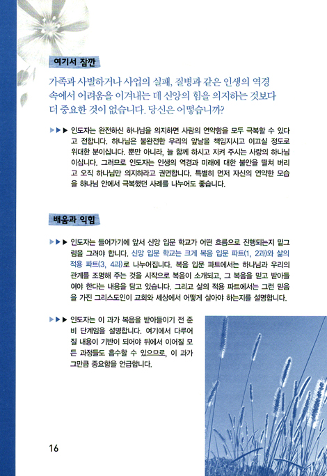신앙 입문 학교는 처음 신앙생활을 하는 분들에게, 또한 신앙의 기본기를 다시금 재정비하고 싶은 분들에게 유익이 될 것입니다. 복음의 핵심과 복음을 받아들인 자들의 삶을 안내해주고 있으며, 평신도들이 거쳐야 할 훈련 단계에서 주춧돌과 같은 역할을 하고 있습니다.