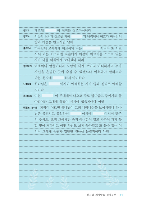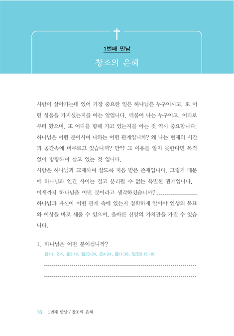 한사람 제자양육 성경공부는 기초편 6과목, 성장편 7과목으로 총 13과목으로 구성되어 새 신자들을 양육해 신앙의 기초를 든든하게 세우는데 초점이 맞추어져 있다. 그러나 기존의 성도들에게도 자신의 신앙생활을 점검하며, 신앙의 중심을 바로 잡는데 좋은 역할을 할 것이다. 특히, 기존 양육체계의 양육자들을 위한 재교육이나 보충교육 프로그램으로 활용하기에도 유익한 교재이다.