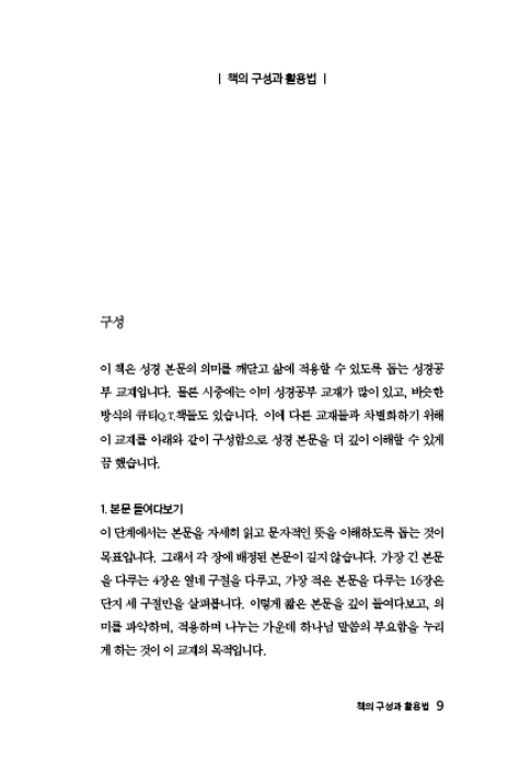 이 책은 성경 본문의 의미를 깨닫고 삶에 적용할 수 있도록 돕는 성경공부 교재입니다. 물론 시중에는 이미 성경공부 교재가 많이 있고, 비슷한 방식의 큐티 Q.T. 책들도 있습니다. 이에 다른 교재들과 차별화하기 위해 이 교재를 아래와 같이 구성함으로 성경 본문을 더 깊이 이해할 수 있게끔 했습니다.