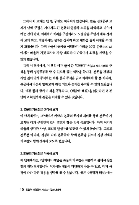 이 책은 한 구절도 그냥 지나치지 않습니다. 이해하기 어려운 구절이라도 도움말을 주면서 계속 생각해 보게 하고, <해답과 해설>에서는 상세하게 설명하고 예화를 들어 이해할 수 있게 도왔습니다. 특히 바울의 논지를 이해하기 어려운 10장 본문(3:15-22)에서는 바울과 거짓 교사의 가상 대화까지 만들어서 흐름을 깨달을 수 있게 도왔습니다.