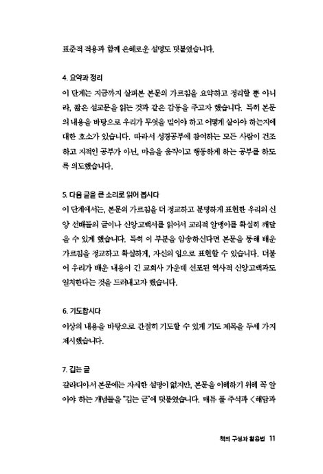 6. 각 장 “요약과 정리” 부분을 통해 지금까지 살펴본 본문의 가르침을 요약하고 정리할 뿐 아니라, 짧은 설교문을 읽는 것과 같은 감동을 주고자 했습니다. 특히 본문의 내용을 바탕으로 우리가 무엇을 믿어야 하고 어떻게 살아야 하는지에 대한 호소가 있습니다. 따라서 성경공부에 참여하는 모든 사람이 건조하고 지적인 공부가 아닌, 마음을 움직이고 행동하게 하는 공부를 하도록 돕습니다.