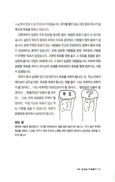 첫째는 구역예배를 통한 성장이고, 둘째는 강단 설교를 통한 성장이며, 셋째는 그룹 성경공부를 통한 말씀의 생활화였습니다. 그래서 본 교재도 세 가지에 초점을 맞추어 일석삼조의 효과를 거두고자 합니다. 단 한권으로 구역예배의 교재, 설교집, Q.T용으로 활용할 수 있도록 집필하였습니다.