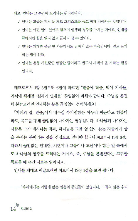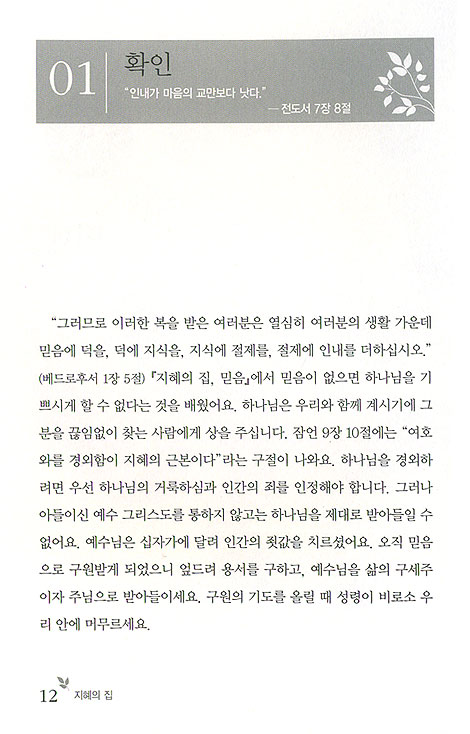 “그러므로 이러한 복을 받은 여러분은 열심히 여러분의 생활 가운데 믿음에 덕을, 덕에 지식을, 지식에 절제를, 절제에 인내를, 인내에 경건을, 경건에 형제 우애를, 형제 우애에 사랑을 더하십시오. 이 모든 것이 여러분의 삶 가운데서 자라난다면, 여러분을 유익하고 쓸모 있는 사람으로 만들어 줄 것입니다. 또한 우리 주 예수 그리스도를 아는 지식이 여러분의 삶을 더욱 풍성하게 해 줄 것입니다.”(베드로후서 1:5~8)
