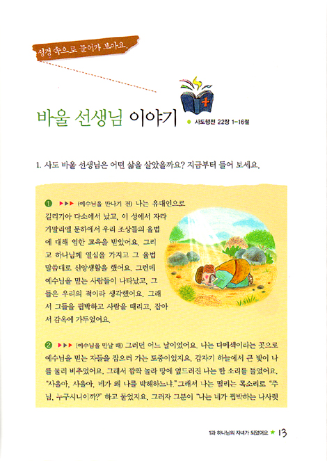 1) 성경이야기 : 과마다 배우는 내용을, 어린이 눈높이에 맞춘 이야기를 통해 어떻게 해야 하는지, 질문을 통해 살펴보게 되어 있으며 실천사항을 살펴봅니다