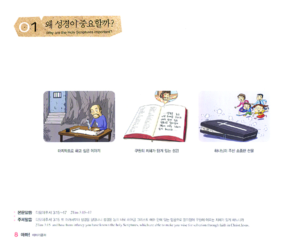 바울이 디모데에게 전한 마지막 편지에서 말했듯이 “어려서부터 배운 성경은 그리스도 예수 안에 있는 믿음으로 말미암아 구원에 이르는 지혜가 있게 하는”것입니다(딤후 3:15). 바라기는 이 교재를 통하여 다양한 연령층의 학생들이 하나님의 은혜와 예수 그리스도의 사랑을 알고 믿고 구원에 이르는 지혜가 충만해지기를 소원합니다.