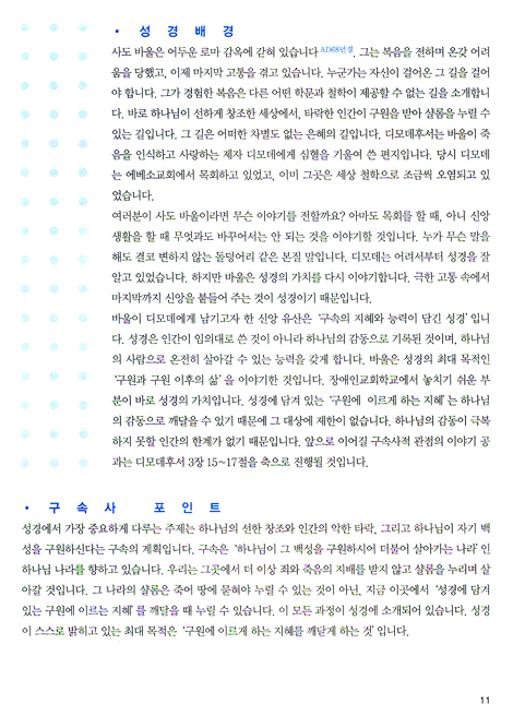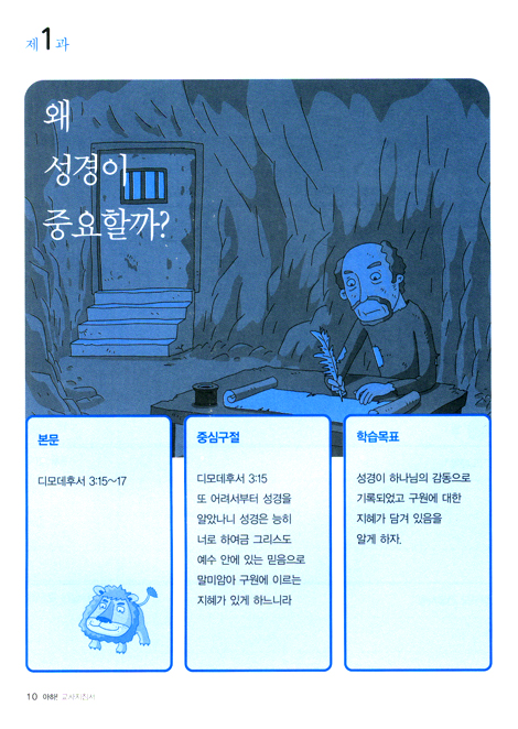 바울이 디모데에게 전한 마지막 편지에서 말했듯이 “어려서부터 배운 성경은 그리스도 예수 안에 있는 믿음으로 말미암아 구원에 이르는 지혜가 있게 하는”것입니다(딤후 3:15). 바라기는 이 교재를 통하여 다양한 연령층의 학생들이 하나님의 은혜와 예수 그리스도의 사랑을 알고 믿고 구원에 이르는 지혜가 충만해지기를 소원합니다.