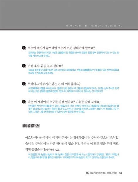 교재 따로 지침서 따로 비교하며 보는 불편을 없앴습니다. 강의 준비에서부터 실전까지 한 권으로 마칠 수 있도록 선생님의 편의를 고려했습니다. 지침서 마지막에 수록된 양 떼 기록부를 활용하시면, 아이들에 대한 정보도 한눈에 확인하실 수 있습니다.