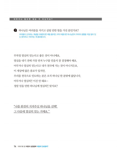 이 책은 어린이 여러분이 쉽고 재미있게 복음을 받아들이도록 만든 성경공부 교재랍니다. 선생님, 친구들과 마음을 열고 이야기를 나누다 보면 여러분을 향한 하나님의 큰 사랑을 넉넉하게 느끼게 될 거예요.