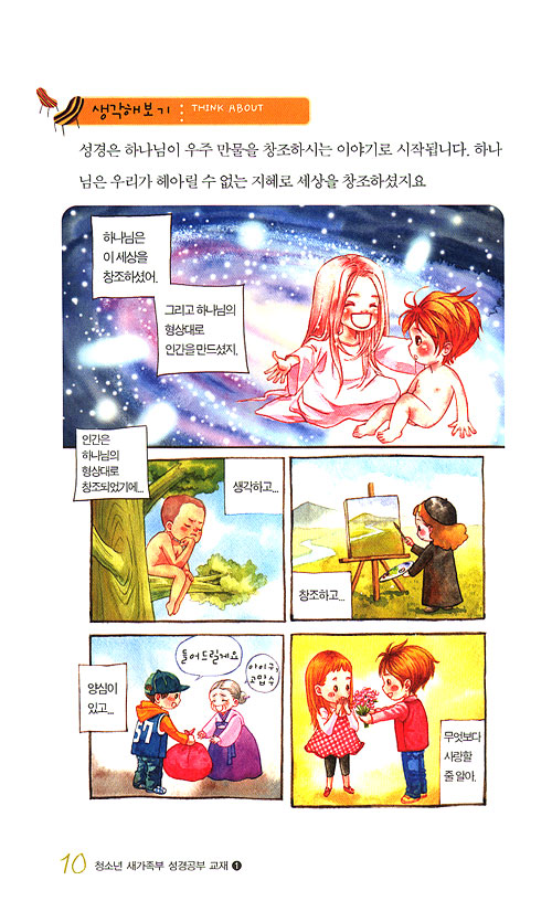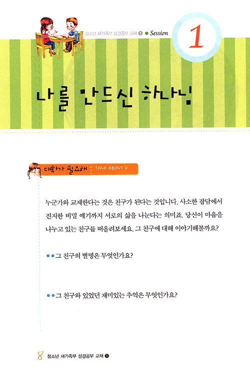 본격적인 성경공부에 앞서 마음을 열고 오늘의 주제에 대해 생각해 보는 시간입니다. <대화가 필요해>에 질문에는 정답이 없습니다. 최대한 자유롭고 솔직하게 자신의 생각을 나누어 보세요. 선생님과 친구들과 한층 가까워지는 걸 느낄 수 있을 거예요.