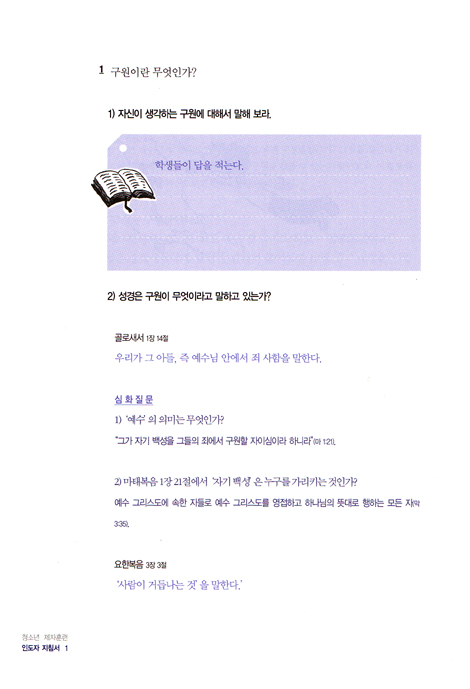 인도자 지침서를 단순한 해답집으로 생각해서는 안됩니다. 중요한 것은 교사가 먼저 자신의 것으로 받아들여 실천하고, 학생들이 따라서 실천하도록 하는 것이 중요합니다.