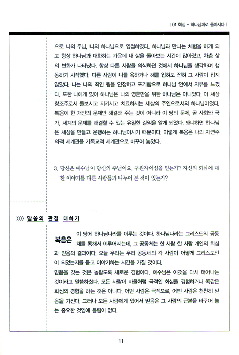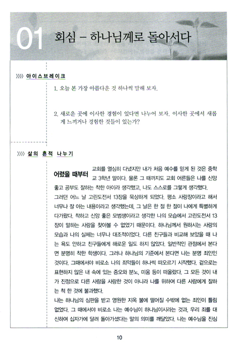 본 교재는 소그룹원들의 생각과 삶을 충분히 나누도록 배려하였고 결국 삶의 변화를 목표로 합니다. 따라서 본 교재는 이 점을 고려하여 내용을 구성하였습니다.