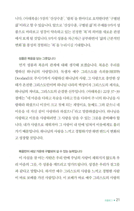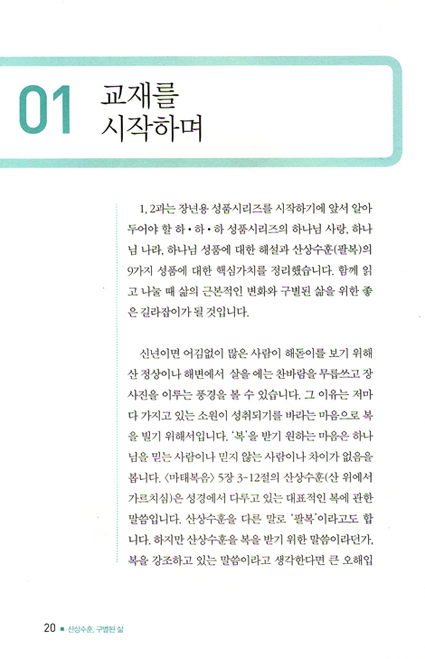 《산상수훈, 구별된 삶》은 새로운 지식을 쌓는 데 머무르지 않고 성품이 새로워지고 삶이 성숙해지는 변화를 이끌어 내는 교재입니다. 그러한 변화된 성품으로 가정이 화목해지고, 나아가 사회가 복음으로 밝아지기를 소망합니다.