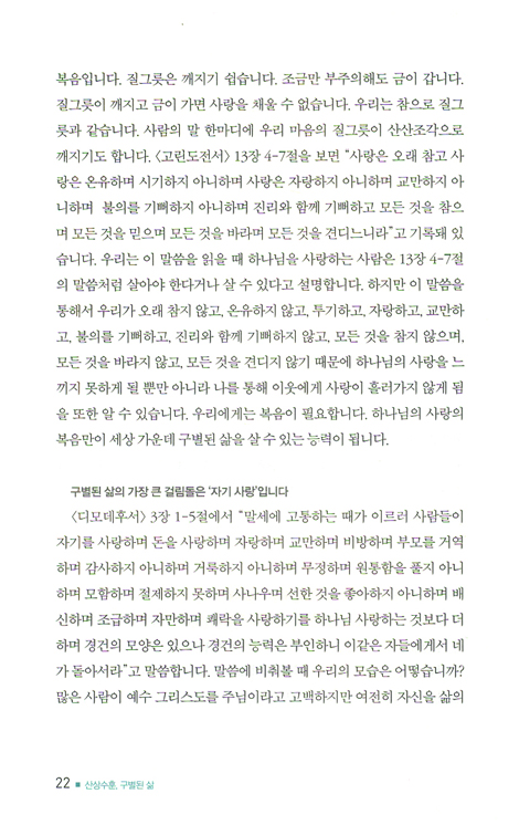 예수님이 가르쳐 주신 성품을 갖기 원하시면 《산상수훈, 구별된 삶》을 통해 마음을 예수께로 열어 보시기 바랍니다. 예수님과 하나 된 마음, 성숙한 성품으로 누리는 천국을 경험하시기를 소망합니다.