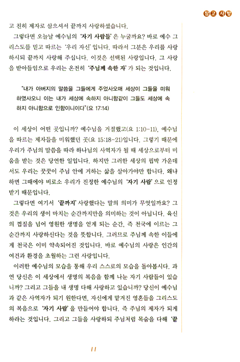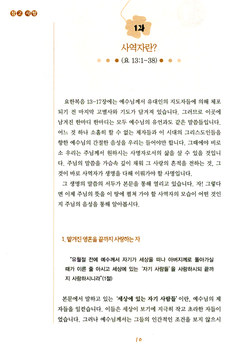 이 교재는‘사역자란 어떤 존재인가’하는 물음에서부터 시작하여 12장에서‘생명과 사랑을 전하는 자’가 진정한‘하늘나라의 사역자’라는 대답을 얻어내기까지 철저하게 복음적인 정신으로 요한복음을 해석하기 위해 힘썼다.