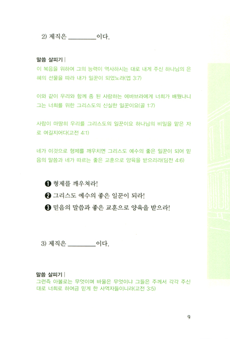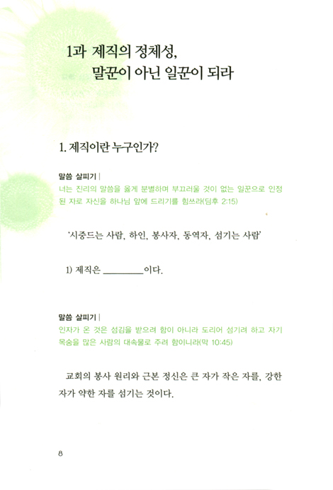 본 교재는 제직으로서 성경적인 올바른 마음가짐과 행동으로 사역을 감당하게 하고자 기획된 제직 훈련 교재입니다.