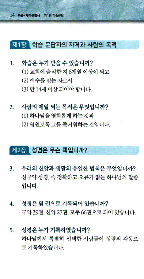 본 문답서에는 학습·세계문답자의 자격, 학습과 세례문답의 기초 문항, 교회생활 및 성도의 생활에 관한 문항, 학습자와 세례자가 꼭 알아야 할 내용, 그리고 부록으로 학습, 입교를 위한 문답모범 등이 수록되어 있습니다.