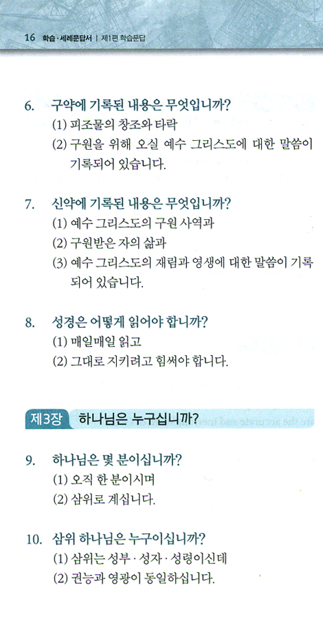 학습, 세계, 입교가 신앙인의 기본 생활에서 가장 기본적이며 핵심적인 사안임을 감안할 때 본 문답서를 통해 주님 안에서 성숙한 그리스도인들이 양육되길 소원합니다. 또한 학습세례문답 해설서를 통해서도 더욱 신앙을 굳건하게 세우기 바랍니다. (후략)