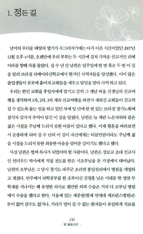 척박한 브라질 땅의 잃어버린 영혼을 위한 선교에 대한 뜨거운 헌신의 삶은 그야말로 우리들의 잠든 영혼을 깨우는 “닭 울음소리”입니다. 많은 분들이 이 책을 읽으면서 광야에서, 메마른 땅에서 아름다운 백합화를 꽃피우는 삶을 살아갈 수 있음을 확신하며 기쁜 마음으로 이 책을 추천합니다.