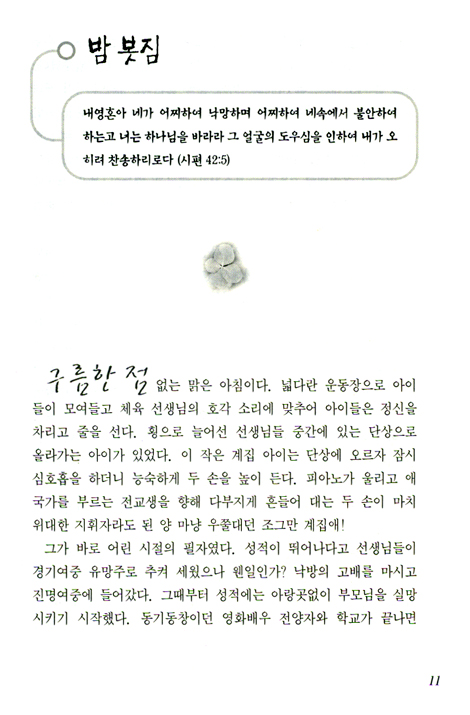 흰 눈이 채 사라지지 않은 한적한 들판 모퉁이를 걷다가 아무렇게나 버려진 주먹만한 차돌을 살짝 들추었더니 겨울을 이겨낸 아기순이 새까만 땅을 비집고 생명을 드러냈습니다. 쓸쓸한 기도원 새까맣게 죽은 줄만 알았던 고목나무 둔탁한 껍질을 살짝 들추다가 또다시 겨울을 이기고 몸을 틀며 나오는 노란 아기 순을 보았습니다. 아기순이 속삭입니다. “나에게 소망을 버리지 말아달라고...”
