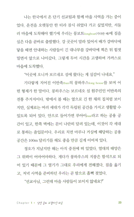 저자는 20여 년이 넘게 말레이시아 보르네오 섬에서 이반족 선교에 헌신해 왔다. 하나님이 부르시고, 인도해 가셨던 길은 그에게 비록 ‘낯선 길’이었찌만, 저자가 묵묵히 그 길을 갈 때 주님은 순간순간마다 특별한 은혜들을 예비해 두셨다. 만약 당신이 지금 하나님의 부르심에 응답하기를 머뭇거리고 있다면, 또는 그분이 보여 주시는 낯선 길에서 불안한 마음이 들어 뒤를 돌아보고 있다면, 주저하지 말고 앞으로 가라고 저자는 격려한다. 주님은 당신을 부르실 때 하셨던 약속들을 신실하게 지키실 것이기 때문이다.