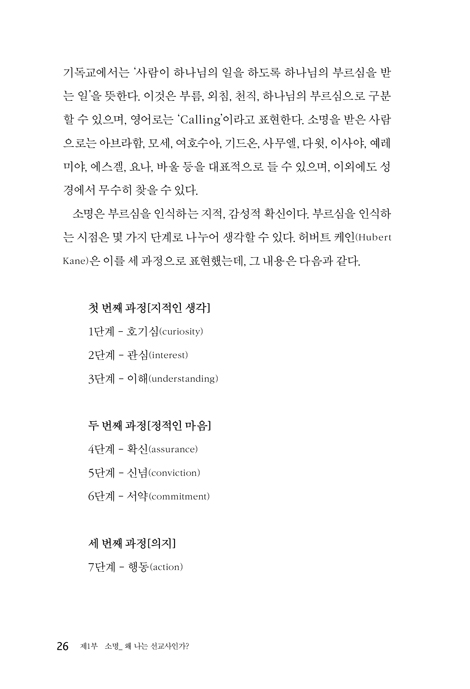 사전적 정의에 의하면 소명이란 ‘임금이 신하를 부르는 명령’이고, 기독교에서는 ‘사람이 하나님의 일을 하도록 하나님의 부르심을 받는 일’을 뜻한다. 이것은 부름, 외침, 천직, 하나님의 부르심으로 구분할 수 있으며, 영어로는 ‘Calling’이라고 표현한다. … 소명은 부르심을 인식하는 지적, 감성적 확신이다. 부르심을 인식하는 시점은 몇 가지 단계로 나누어 생각할 수 있다. 허버트 케인(Hubert Kane)은 이를 세 과정으로 표현했는데, 그 내용은 다음과 같다.