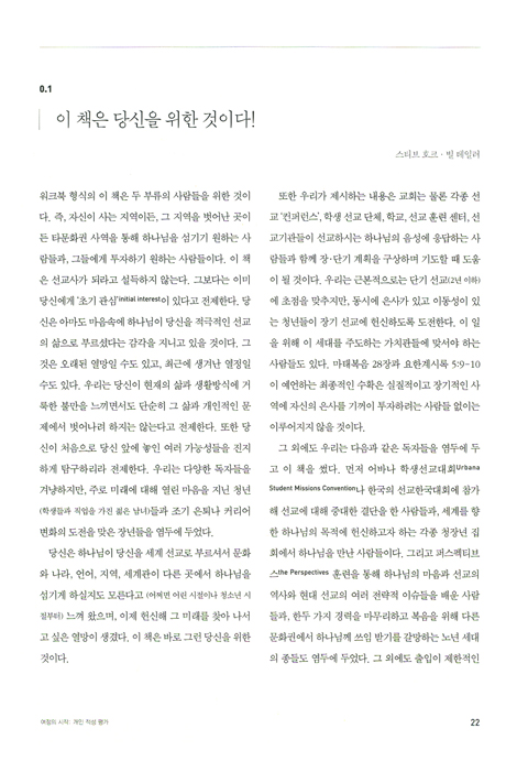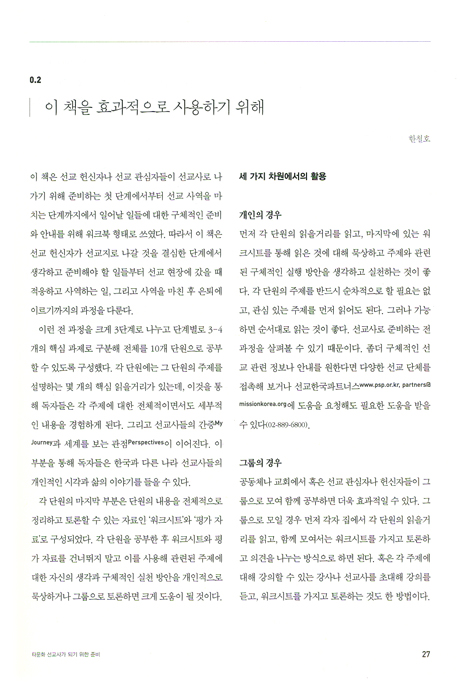워크북 형식의 이 책은 두 부류의 사람들을 위한 것이다. 즉, 자신이 사는 지역이든, 그 지역을 벗어난 곳이 든 타문화권 사역을 통해 하나님을 섬기기 원하는 사람들과, 그들에게 투자하기 원하는 사람들이다. 이 책은 선교사가 되라고 설득하지 않는다. 그보다는 이미 당신에게 ‘초기 관심’initial interest이 있다고 전제한다. 당신은 아마도 마음속에 하나님이 당신을 적극적인 선교의 삶으로 부르셨다는 감각을 지니고 있을 것이다. 그것은 오래된 열망일 수도 있고, 최근에 생겨난 열정일 수도 있다. 우리는 당신이 현재의 삶과 생활방식에 거룩한 불만을 느끼면서도 단순히 그 삶과 개인적인 문제에서 벗어나려 하지는 않는다고 전제한다. 또한 당신이 처음으로 당신 앞에 놓인 여러 가능성들을 진지하게 탐구하리라 전제한다. 우리는 다양한 독자들을 겨냥하지만, 주로 미래에 대해 열린 마음을 지닌 청년(학생들과 직업을 가진 젊은 남녀)들과 조기 은퇴나 커리어변화의 도전을 맞은 장년들을 염두에 두었다. (“여정의 시작: 개인 적성 평가”, 22쪽)