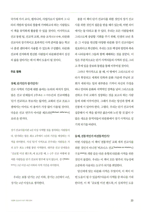 선교사의 여정을 시작하기 전에, 당신이 누구이며 지금 어디에 있는지 잠시 생각해 보아야 한다. 선교사의 여정을 시작할 준비가 얼마나 되었는지 알아보기 위해 기본적인 ‘개인 적성 평가’(‘여정의 기초 다지기: 4가지 개인 적성 평가’를 보라. 48-50페이지)를 해 보는 것이 도움이 될 것이다. 이 평가는 3가지 단계, 즉 자기 인식, 민감성, 그리고 실제적인 기술들을 척도로 현재 당신이 어떤 상태에 있으며 얼마나 준비되었는지 가늠한다. 이 책의 첫 부분은 타문화 선교사란 누구인가에 대해 깊이 다룰 것이다. 이것을 통해 오늘날에도 여전히 필요한 타문화 선교사의 특징적인 몇 가지 역할에 대해 뚜렷한 윤곽을 갖게 될 것이다. (서문 중에서)
