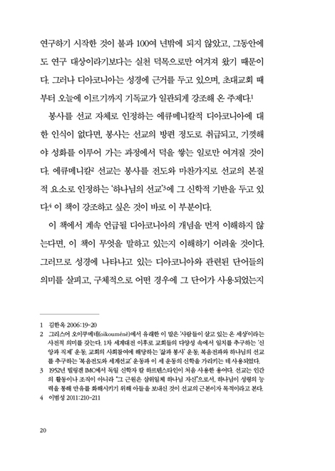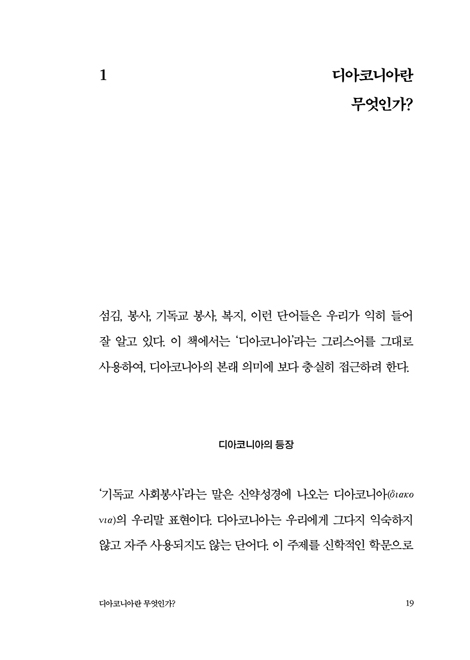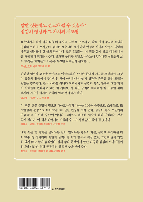 이 책은 많은 설명이 필요한 디아코니아의 내용을 100쪽 분량으로 소개하고, 또 그만큼의 분량으로 디아코니아의 실천 현장을 보여 준다. 섬김이 단지 누군가의 마음을 열기 위한 ‘수단’이 아니라, 그리스도 복음의 핵심에 대한 이해라는 것을 알게 된다면, 이 책을 탄생시킨 이들의 수고가 정말 값진 일이 될 것이다.