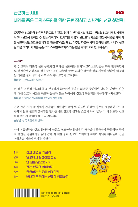 오랫동안 선교한국 상임위원장으로 섬겼고, 현재 미션파트너스 대표인 한철호 선교사가 일상에서 누구나 선교에 참여할 수 있는 아이디어 51가지를 새롭게 선보인다. 사소한 일상에서 출발하여 작은 선교적 실천으로 공동체에 활력을 불어넣는 방법, 이주민 다문화 사역, 온라인 선교, 시니어 선교 등 지금 여기서 세계를 품은 그리스도인으로 자라 가는 법을 구체적으로 안내해 준다.