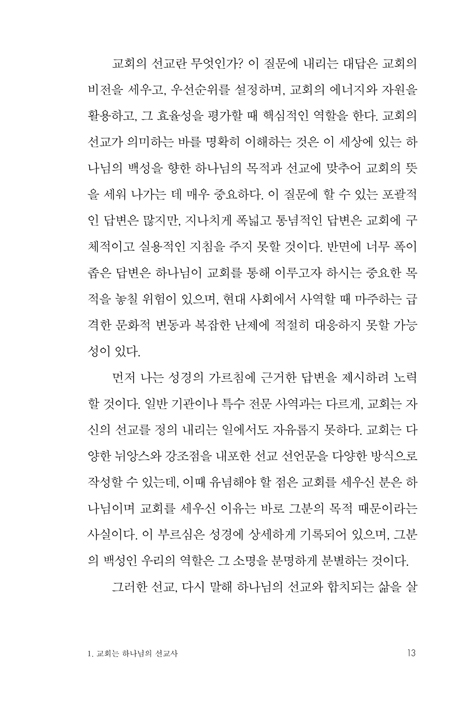 우리의 사역은 아무 교회나 세우고 확장(배가)하는 것이 아니다. 우리의 선언문은 변혁적 교회를 확장해 가는 것이 우리의 부르심임을 명확히 한다. 이번 장을 올바르게 이해한다면, 교회가 공동체 형태로 존재하는 것은 교회 자체의 목적을 위해서가 아니며, 죄의 저주를 뒤집고 하나님의 통치를 이루어 내고 모든 만물을 새롭게 하며 이 세상을 회복시키는, 하나님의 새롭게 하시는 능력을 드러내는 곳이 교회라는 사실을 깨닫게 될 것이다. 교회는 구원하시고 새롭게 하시는 하나님의 능력이 나타난 결과이고, 앞으로 온전히 이루어질 하나님 나라가 어떠한 나라인지를 알게 해 주는 곳이다. 변혁적 교회는 복음 선포와 그리스도로 인해 변화된 제자들의 재생산으로만 확장될 수 있다. _ <2. 하나님의 새 창조가 시작된 교회> 중에서
