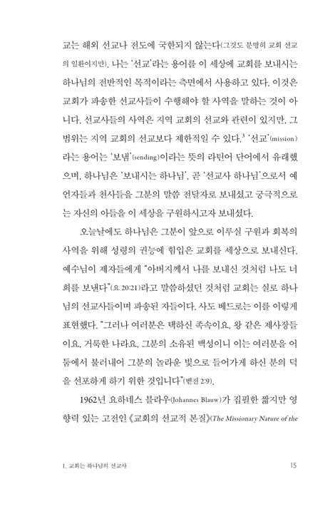 나는 ‘선교’라는 용어를 이 세상에 교회를 보내시는 하나님의 전반적인 목적이라는 측면에서 사용하고 있다. 이것은 교회가 파송한 선교사들이 수행해야 할 사역을 말하는 것이 아니다. 선교사들의 사역은 지역 교회의 선교와 관련이 있지만, 그 범위는 지역 교회의 선교보다 제한적일 수 있다. ‘선교’(mission)라는 용어는 ‘보냄’(sending)이라는 뜻의 라틴어 단어에서 유래했으며, 하나님은 ‘보내시는 하나님’, 곧 ‘선교사 하나님’으로서 예언자들과 천사들을 그분의 말씀 전달자로 보내셨고 궁극적으로는 자신의 아들을 이 세상을 구원하시고자 보내셨다. 오늘날에도 하나님은 그분이 앞으로 이루실 구원과 회복의 사역을 위해 성령의 권능에 힘입은 교회를 세상으로 보내신다. _ <1. 교회는 하나님의 선교사> 중에서