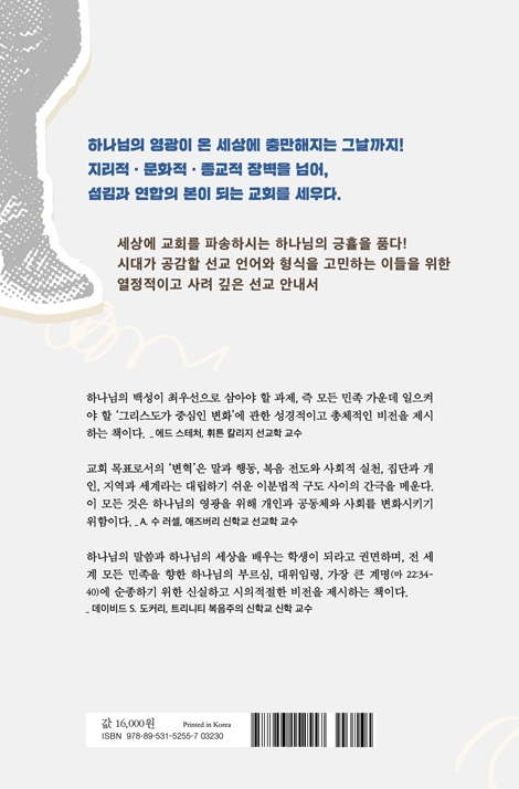 이 책은 교회의 선교에 대해 참신하고 도전적인 새로운 관점을 제시한다. 저자는 교회의 목표와 방향이 ‘하나님의 영광을 확장하기 위한 변혁’임을 풍성한 성경 주해로 명확히 밝힌다. 교회의 목적이자 목표로서의 ‘변혁’은 말과 행동, 복음 전도와 사회적 실천, 집단과 개인, 지역과 세계라는 대립하기 쉬운 이분법적 구도 사이의 간극을 메운다. 이 모든 것은 하나의 목적을 지향한다. 즉 하나님의 영광을 위해 개인과 공동체와 사회를 변화시키는 것이다. 저자는 자기중심적이고 개인화된 영성에서 벗어나 목적이 있는 제자도로 나아간다. 이 책은 선교하는 교회의 새로운 비전을 위해 성경에 기초한 정교한 청사진을 읽기 쉽게 제시한다. 나는 변혁을 일으킬 다음 세대를 가르칠 때 이 책을 자주 인용할 것이다.