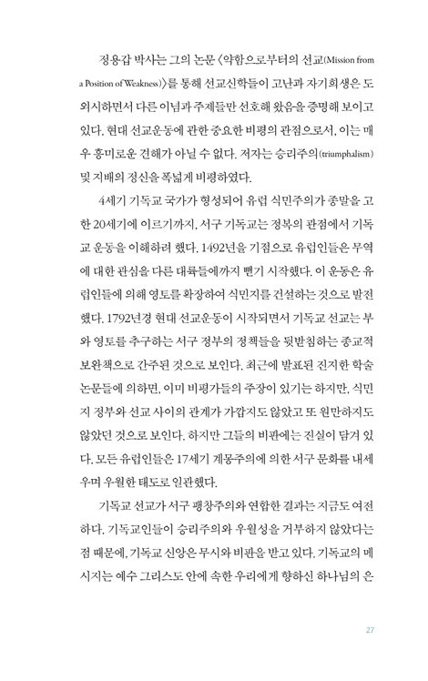 《약함으로부터의 선교》는 고난받는 종이시며 통치하시는 주님이신 그리스도를 겸손히 따르도록 오늘의 선교에 던지는 시의적절한 도전입니다. 권력과 복음이 결합되는 순간, 그리스도의 구원 메시지와 겸손한 섬김의 복음은 필연적으로 왜곡되고 부패됩니다.