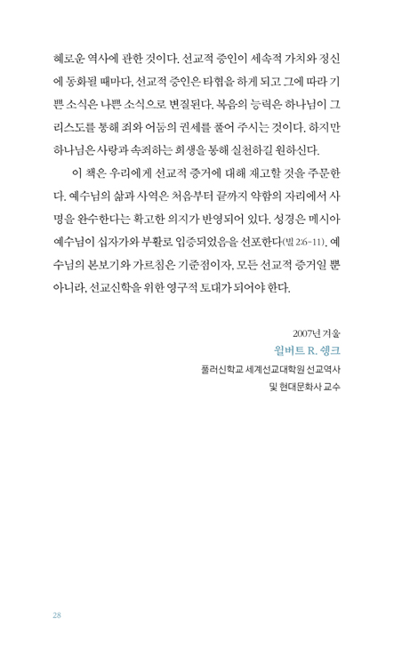 ‘약함으로부터의 선교’는 능력의 부재가 아니라 하나님의 능력에 전적으로 의탁하는 신앙과 사역의 방식입니다. 하나님의 세계 선교에 진지하게 헌신하고자 하는 모든 이들에게 이 책을 기쁨으로 추천합니다.