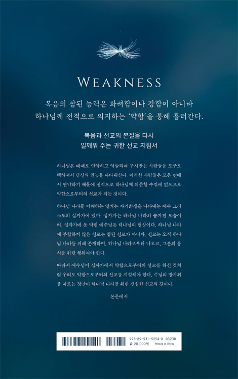 이 책은 오늘날 성과와 규모, 권력과 영향력 중심으로 흐르기 쉬운 선교 현실 속에서, 복음의 본질에 근거한 선교의 방향을 다시 성찰하도록 돕는 신학적 안내서다. 2009년에 출간된 《약함으로부터의 선교》의 개정증보판으로, 여러 오역을 세심하게 바로잡고 수차례의 교정을 거쳐 새롭게 단장해 출간되었다. 저자는 예수 그리스도의 십자가에 나타난 ‘약함의 신학’을 토대로, 누가복음–사도행전과 바울 서신에 나타난 성경적 근거를 비롯해, 세계 선교 역사와 주요 현대 선교학 도서들을 폭넓게 분석하고, 한국교회의 선교 역사와 연결하여 선교의 본질을 재조명한다. 이를 통해 선교의 주체이신 하나님께서 어떻게 낮고 소외된 자들을 통해 그분의 전능하심을 드러내시는지, 그리고 오늘날 교회가 회복해야 할 ‘약함의 영성’이 무엇인지 깊이 있게 제시한다.
