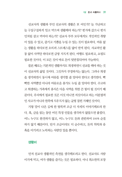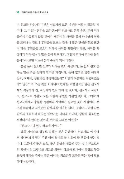 레소토는 한국 선교사가 없어서 비교가 안 되지만 인접 국가인 남아공만 해도 많은 선교사님들의 자녀가 굉장히 값비싼 학교에 다니고 있다. 물론 저렴하고 좋은 교육을 받는 자녀들도 있다. 한 지역에 국한된 것이긴 하지만 요하네스버그와 프레토리아 두 대도시 지역에는 선교사의 자녀들이 꽤 비싼 학교에 서슴지 않고 다닌다는 이야기를 쉽게 듣는다. 거기에 비싼 과외 활동까지 한다. 그런 아이들을 보면 아주 좋은 집에 살고 있다는 것이다. -39p-