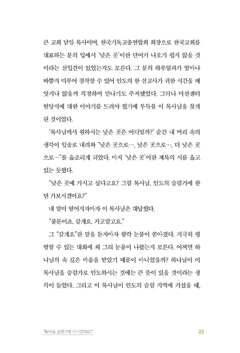 23년의 선교사역을 통해 깨달은 사실이 있습니다. 인도로 가는 그 길은 바로 집으로 가는 길이라는 사실 말입니다. 저는 주님의 뜻에 따라 인도로 왔지만 제가 가는 이 길은 영원한 본향인 아버지 집으로 가는 여정입니다. 저는 사랑하는 인도 사람들과 함께 아버지 집으로 가고 싶습니다. 아버지 집으로 가기 위해선 인도하심을 제대로 받아야 합니다. 그분의 인도 없인 저나 우리 모두는 길을 잃을 수밖에 없습니다. 우린 반드시 아버지 집으로 가야 할 사람들입니다. 제가 깨달은 바론 주님의 인도하심을 받기 위한 전제조건은 철저한 낮아짐이었습니다. 가난하고 낮은 심령이 되었을 때에만, 그분이 보이며, 그분의 인도를 받을 수 있습니다.