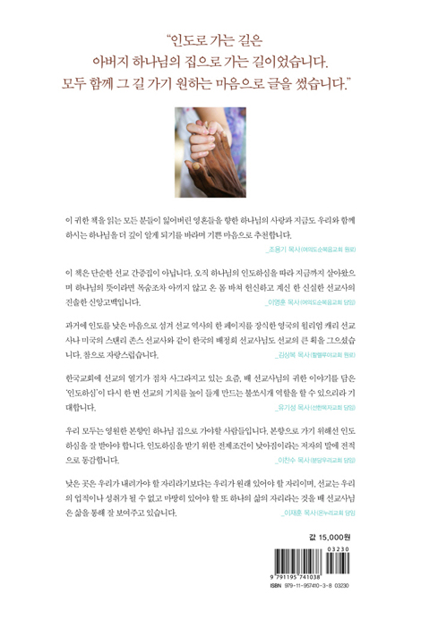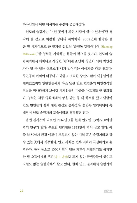 이 글을 마치면서 좋은 소식은 주 예수 그리스도 밖에 없다는 사실을 다시 한 번 강조하고 싶다. 난 좋은 이 되시는 주 예수님께 인생을 걸었다. 행복한 나날들이었다. 내 주님이 사랑하는 인도 사람들을 사랑하는데 인생의 황금기를 바쳤다. 주님의 사역에 조금이라도 동참할 수 있었기에 의미 있는 나날들이었다. 함께 해 줬던 분들로 인해 늘 따뜻했다. 돌아보니 후회 없는 인생이었다. 남은 삶 동안에도 아낌없이 바치리라. 다시 태어나도 주저 없이 이 소중한 선교의 길을 갈 것이다. 인생은 한 번 사는 것. 이 단 한 번의 삶을 영원한 가치를 위해 투자하는 사람은 결코 어리석지 않다. _p.408