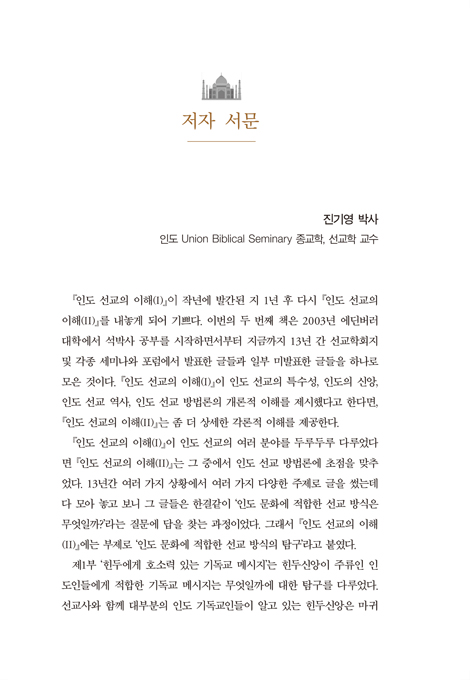 인도의 신학생들에게 힌두교와 선교를 가르치는 탁월한 학자 이자 헌신적인 선교사이신 진기영 선교사님이 지금까지 드린 수많은 시간과 땀과 눈물의 열매인 이 책을 통해 한국 교회의 인도 선교가 올바른 지식과 방향, 비전 가운데 더욱 풍성한 열매를 맺게 하는 씨앗이 될 줄로 믿고 기쁨과 감사함과 확신으로 추천합니다.