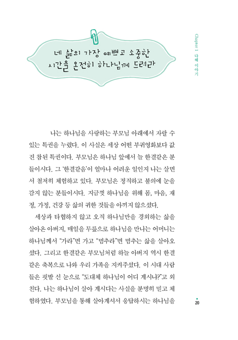 몇 년 전 제가 가장 아프고 힘든 시기를 겪고 있을 때 아버지께서 해주신 말씀이 기억이 납니다. “길거리에 핀 꽃 한 송이를 보고도 하나님 나라를 볼 수 있는 사람이 되었으면 좋겠다.” (90쪽)