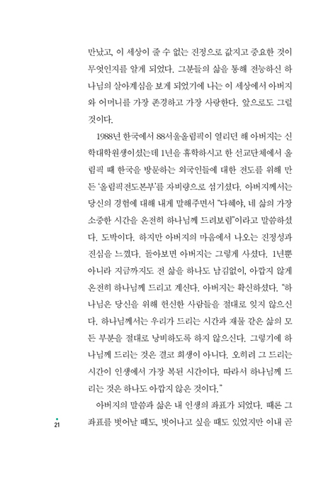 부모님이 보여주신 것은 엄청난 기적들이 아니었다. 그저 하나님을 향한 한결같은 신실함이었다. 어떤 경우에도 반복적으로 늘 하나님을 선택하신 순전한 의리였다. 그 신실함과 순전함이 내 삶의 나침판이 되었다. 그 나침판을 따라 살다 보니 부모님 신앙의 자세가 내 삶의 거룩한 습관이 되었다. 이것이야말로 내가 부모님께 받은 최고의 유산이다. (23쪽)